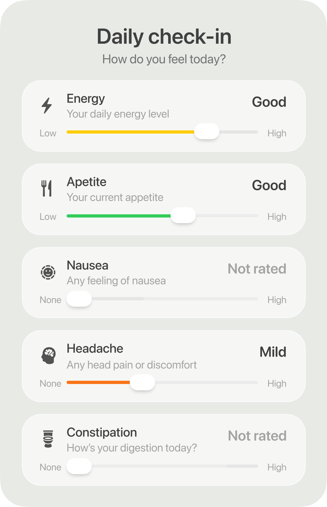 The only app that helps you truly understand and manage your treatment. Track your doses, symptoms, and progress with ease. Get timely reminders, personalized insights, and clear trends so you always stay in control - without the overwhelm.